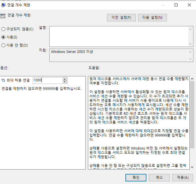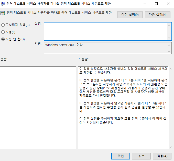 "원격 데스크톱 서비스를 하나의 원격 데스크톱 서비스 세션으로 제한"