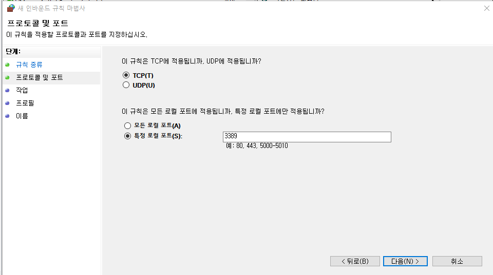 다음으로 방화벽 인바운드에 3389 포트를 개방해주자!