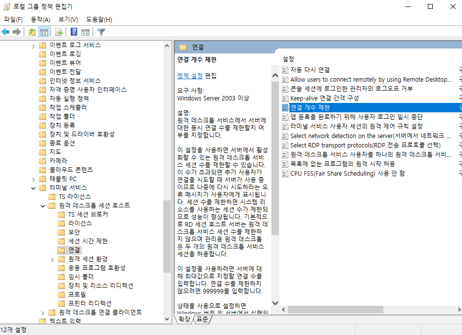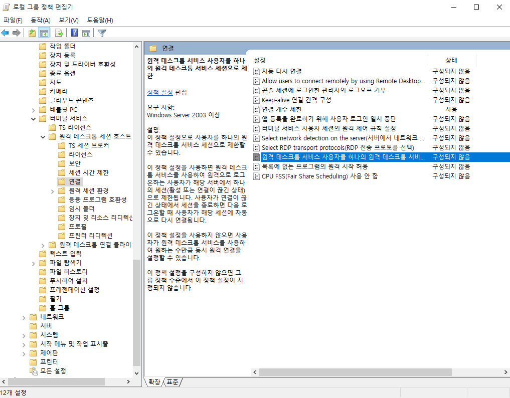 컴퓨터 구성 > 관리 템플릿 > 터미널 서비스 > 원격 데스크톱 세션 호스트 > 연결 순으로 들어가보자