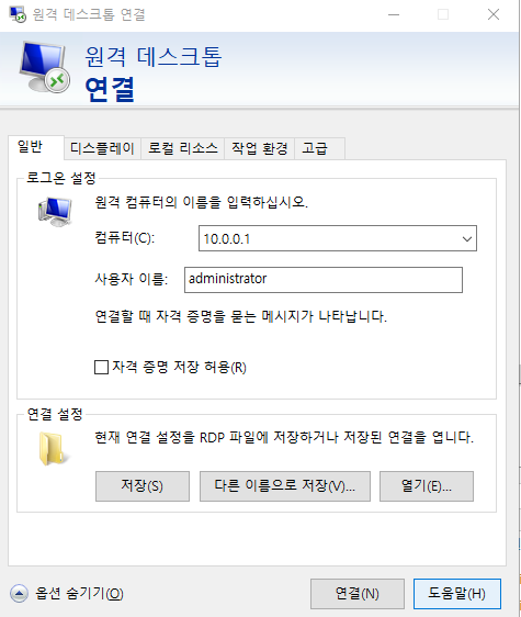 IP와 접속할 계정,패스워드까지 입력해주자.(포트 설정은 기본으로 3389이다.)