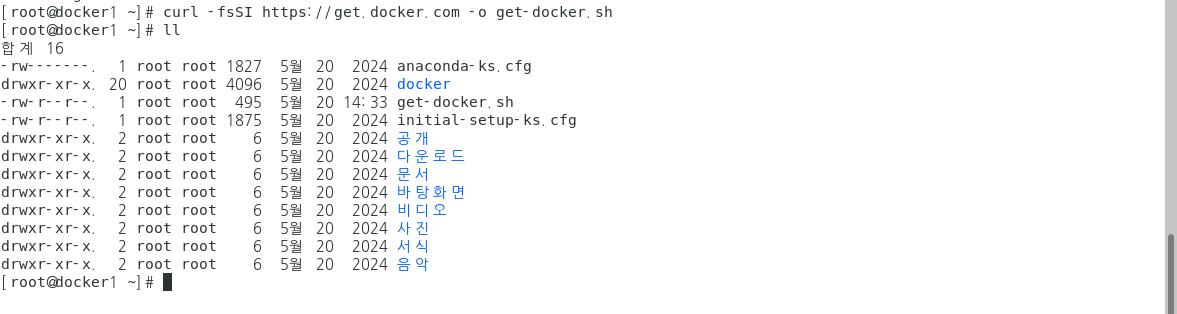 현재 디렉토리에 get-docker.sh 파일이 다운로드 됐는지 확인