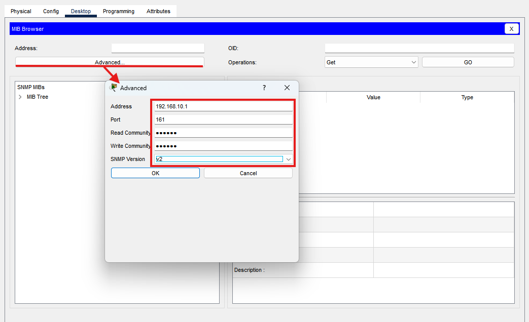 패킷트레이서에선 각 네트워크 장치에서 커뮤니티 값만 설정할 수 있다.