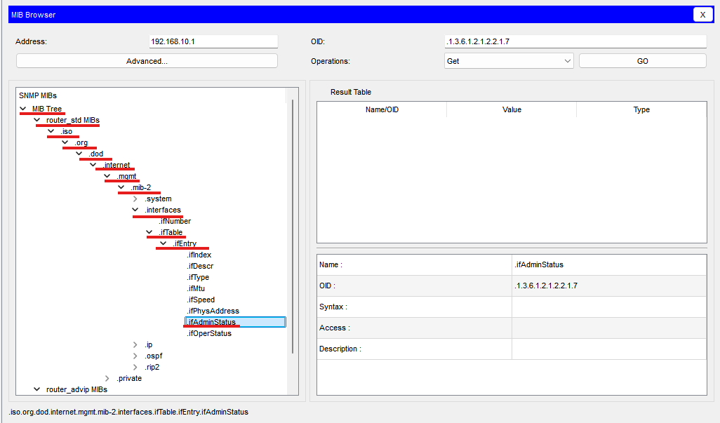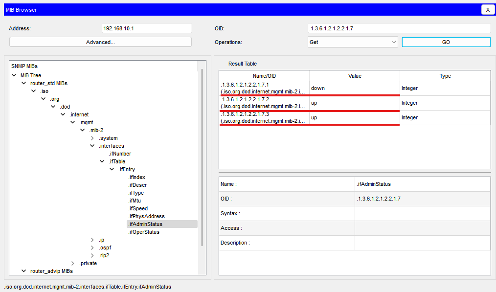 트리의 ifAdminStatus를 선택하고 오른쪽 위의