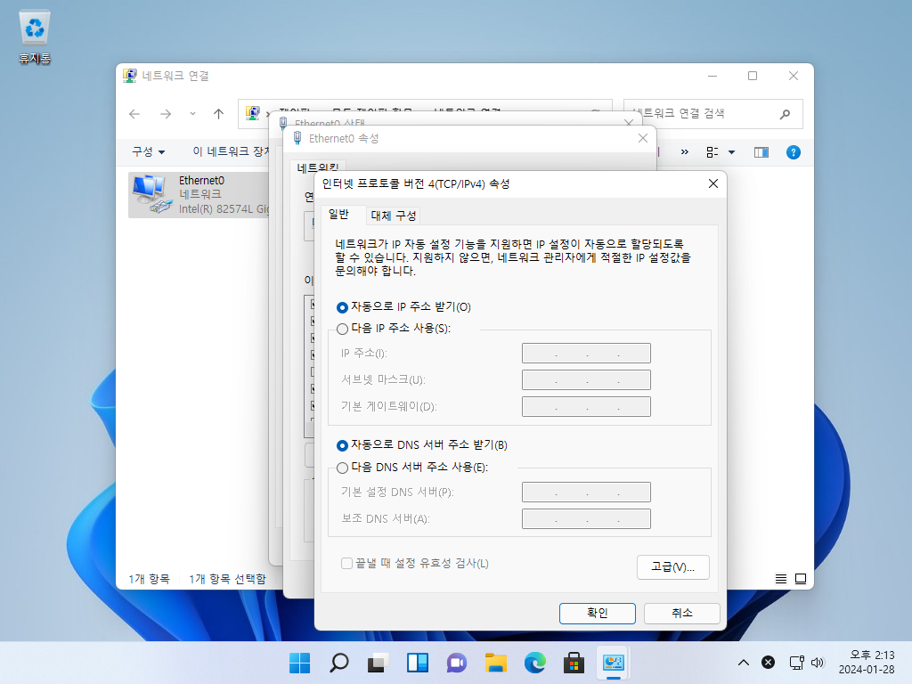 각 윈도우 ncpa.cpl에서 자동으로 IP,DNS를 받아오겠다.