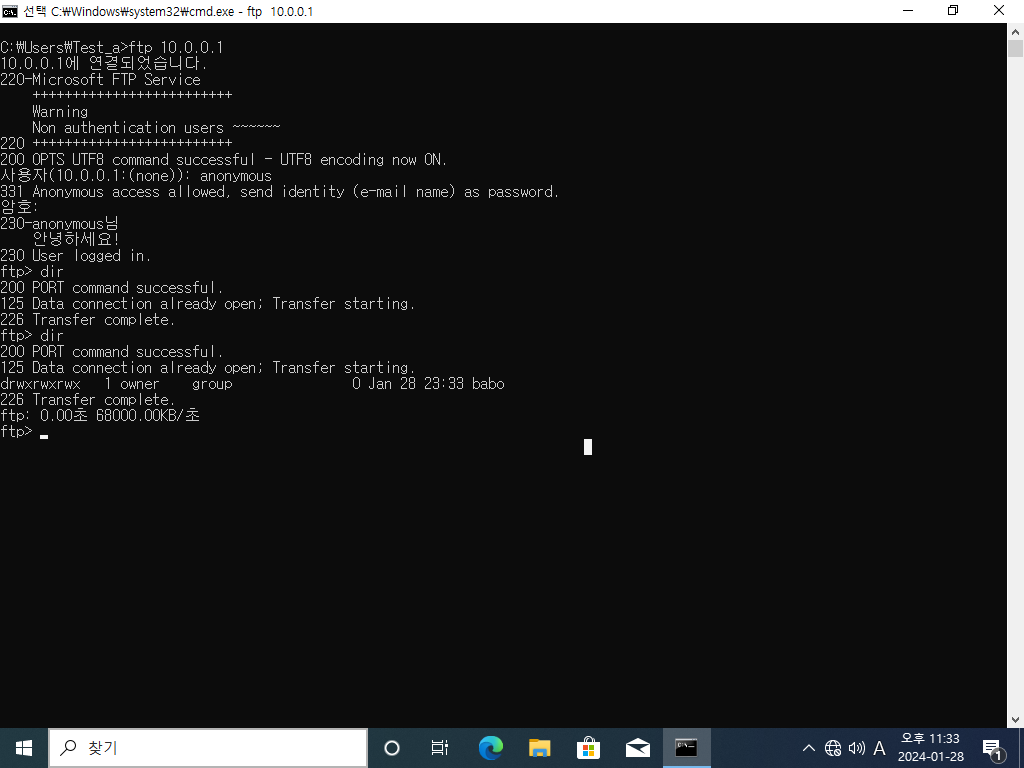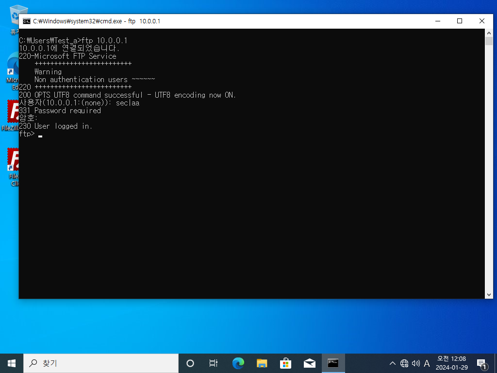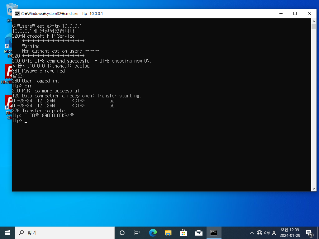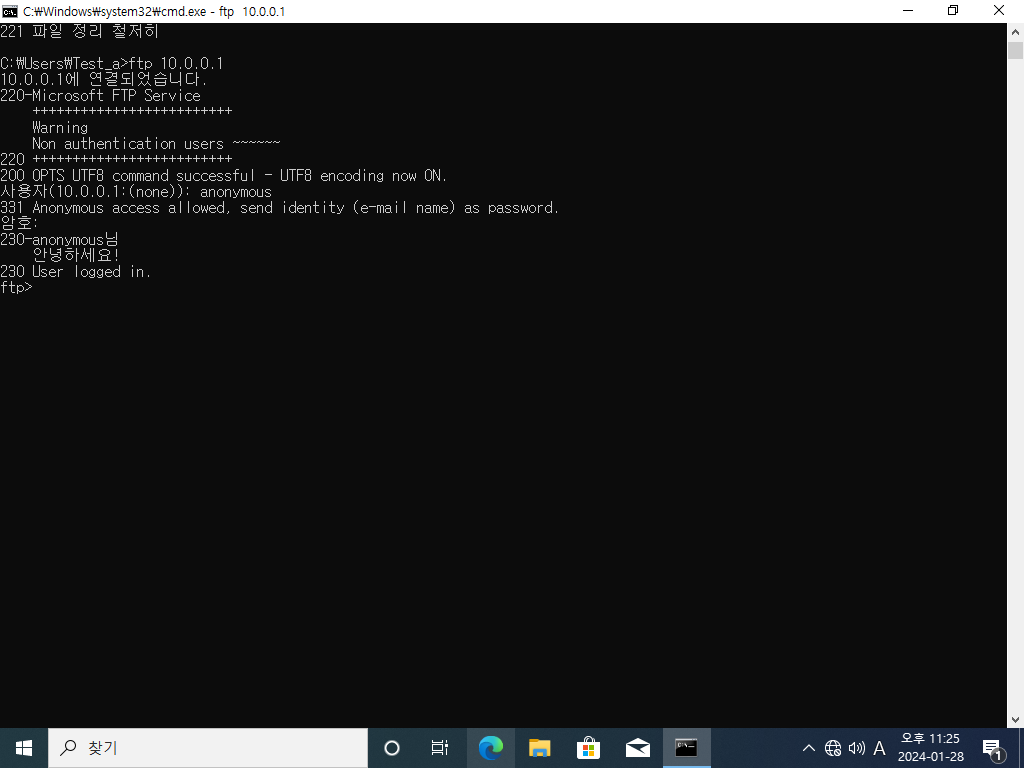 cmd 창에서 ftp 10.0.0.1로 서비스 접속이 가능하다.