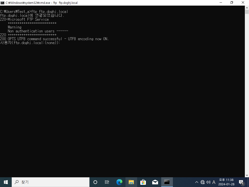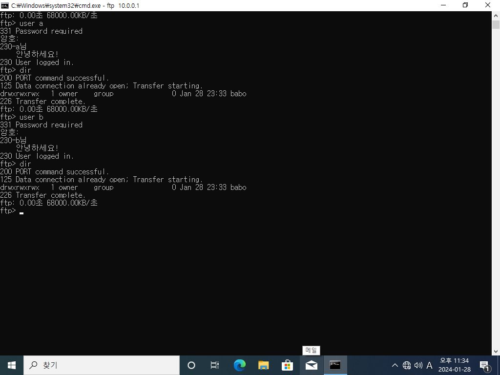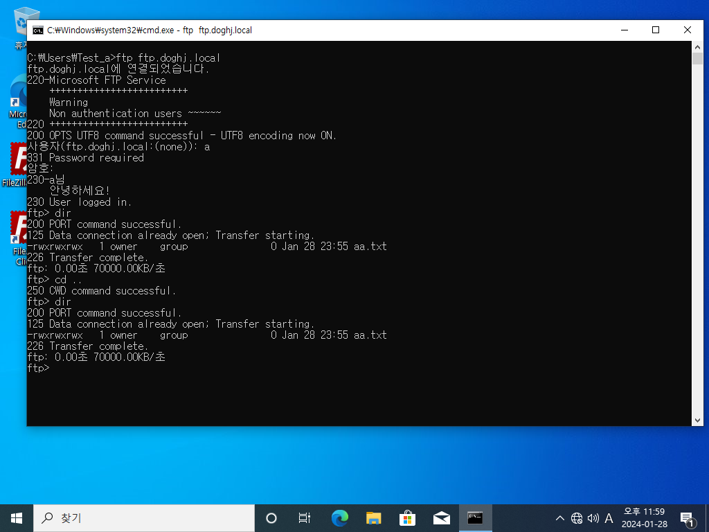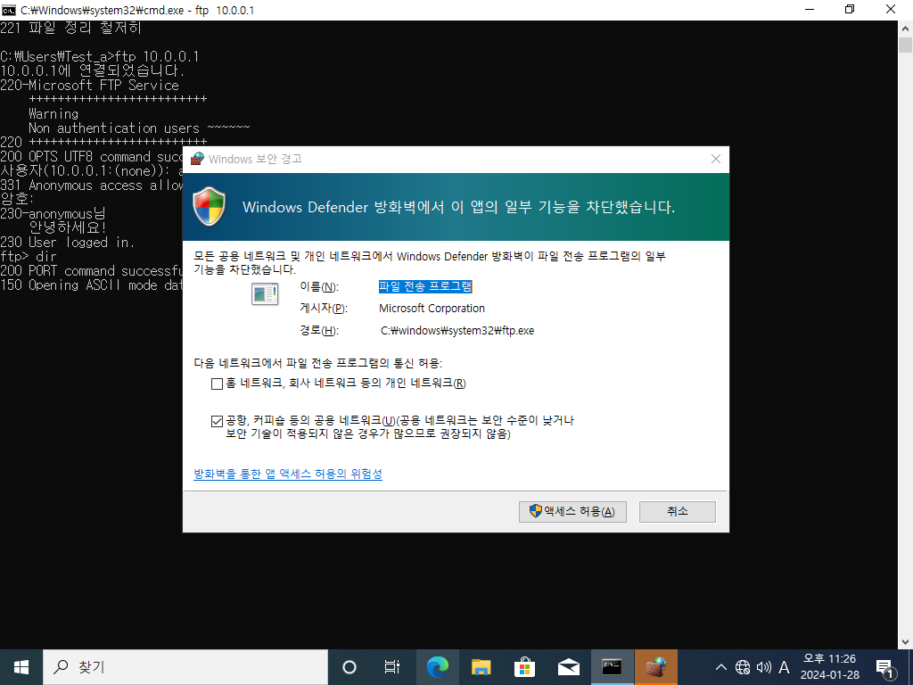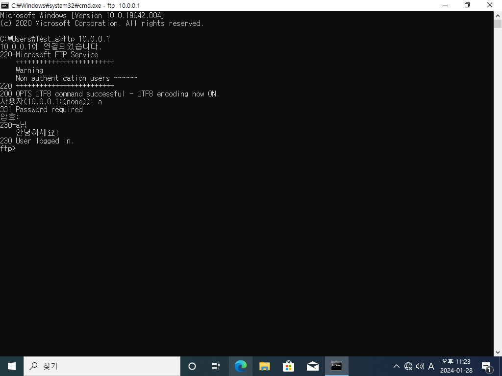 cmd 창에서 ftp 10.0.0.1로 서비스 접속이 가능하다.