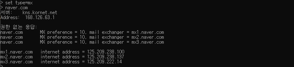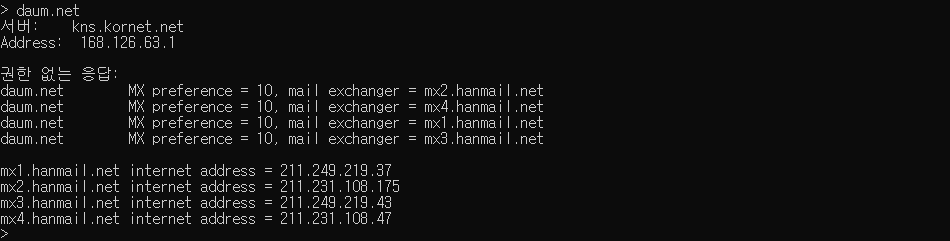 mx가 붙어있는 주소가 모두 메일 교환기이다.