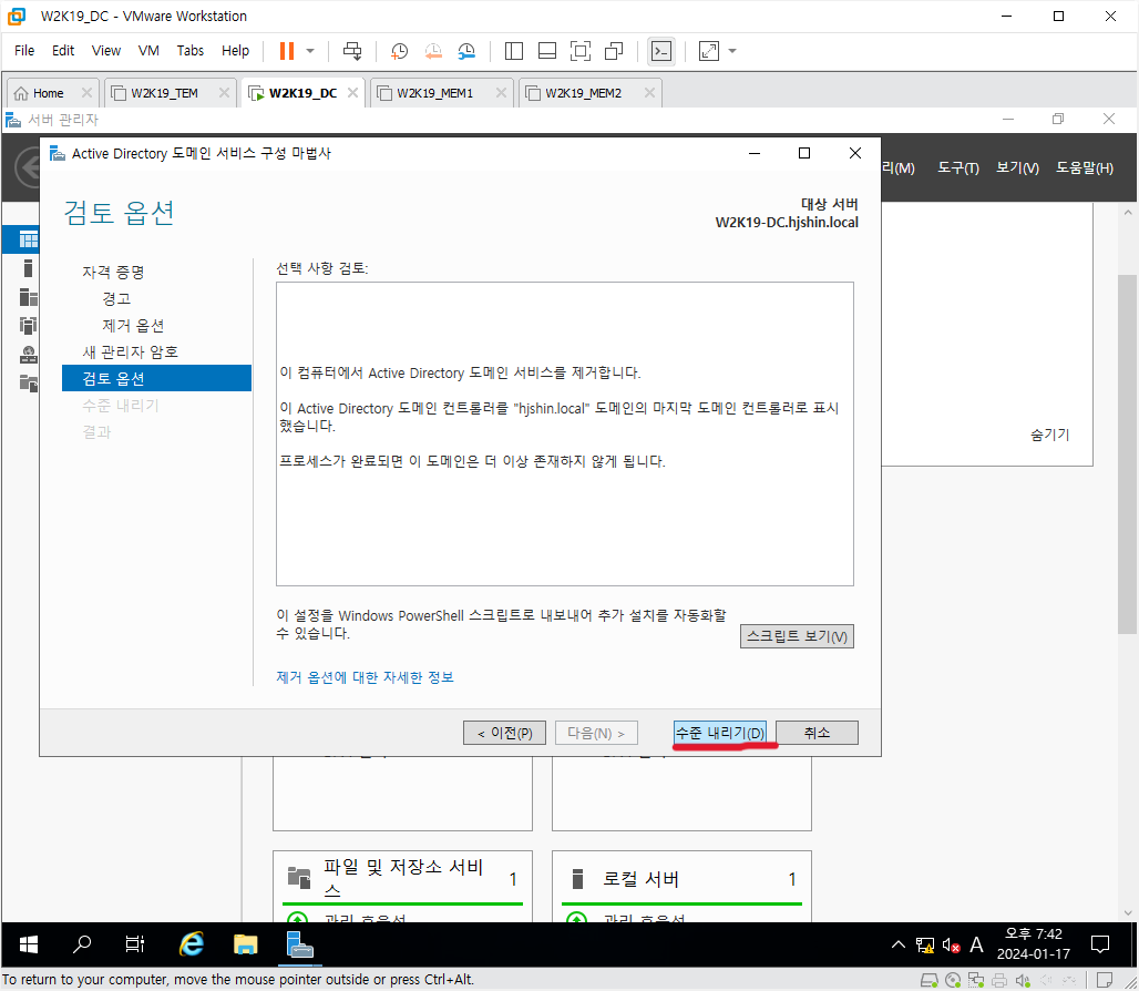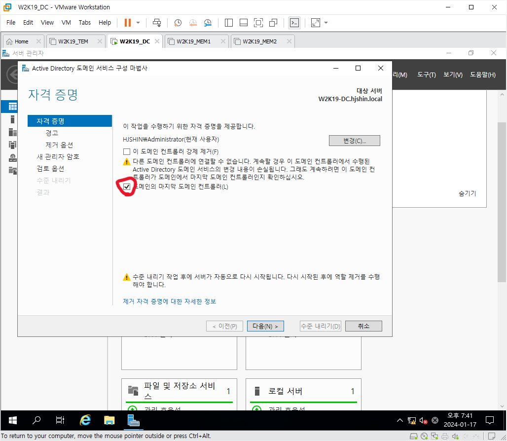 여기서 조심해야 할 것이 제일 처음 자격 증명 부분의 사용자가 반드시 포리스트의 루트 도메인이여야 한다!