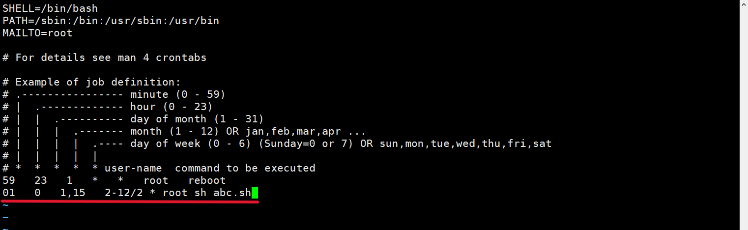 (01분) (0시) (1,15일) (2-12/2월) (매요일) (root) (abc.sh)