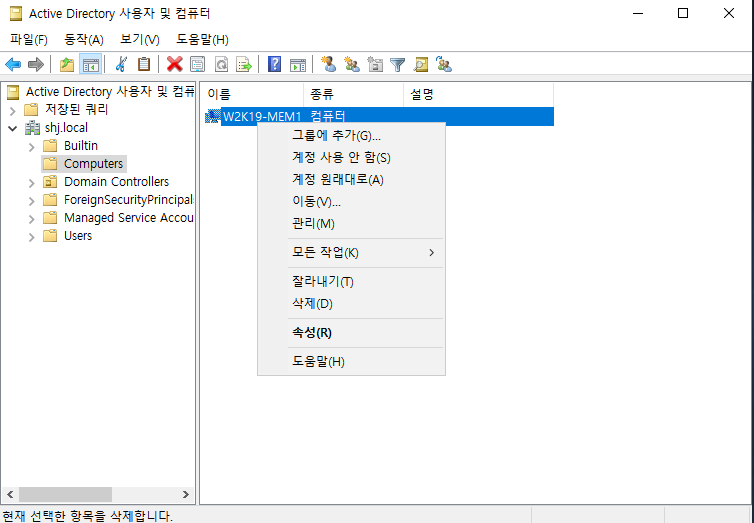 DC서버로 넘어와서 사용자 및 컴퓨터에서 멤버서버 Account를 삭제해 보겠다.