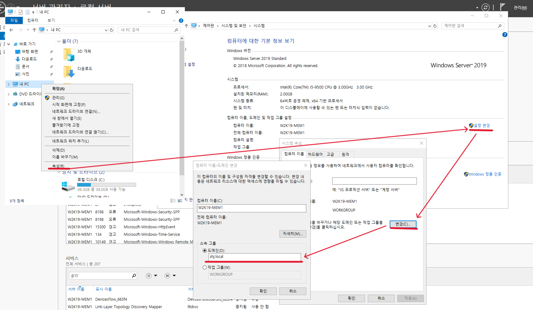 먼저 Member Server가 될 W2K19-MEM1 컴퓨터의 기본 DNS를 DC의 IP로 변경해준다.