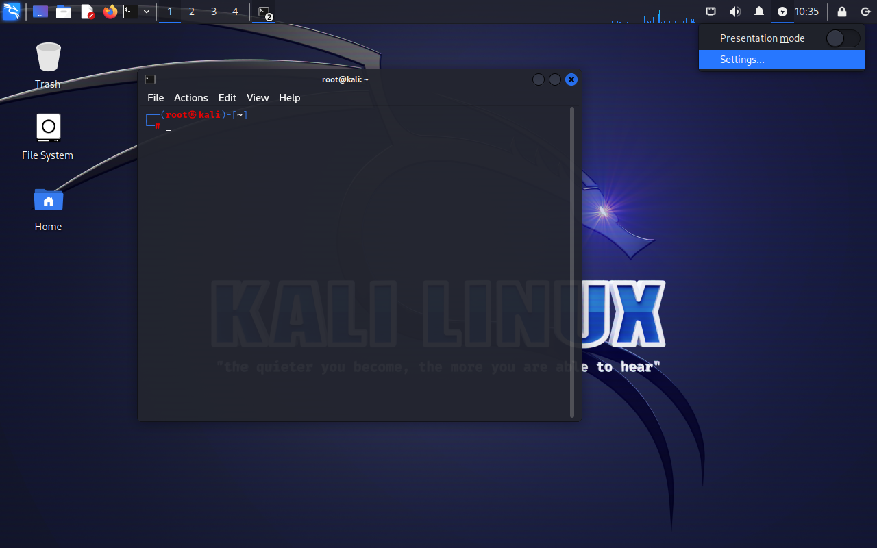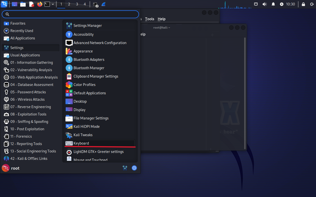 왼쪽 위의 KALI 마크를 누르면 이렇게 시작페이지 같은 창이 뜬다.