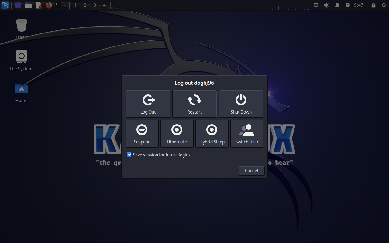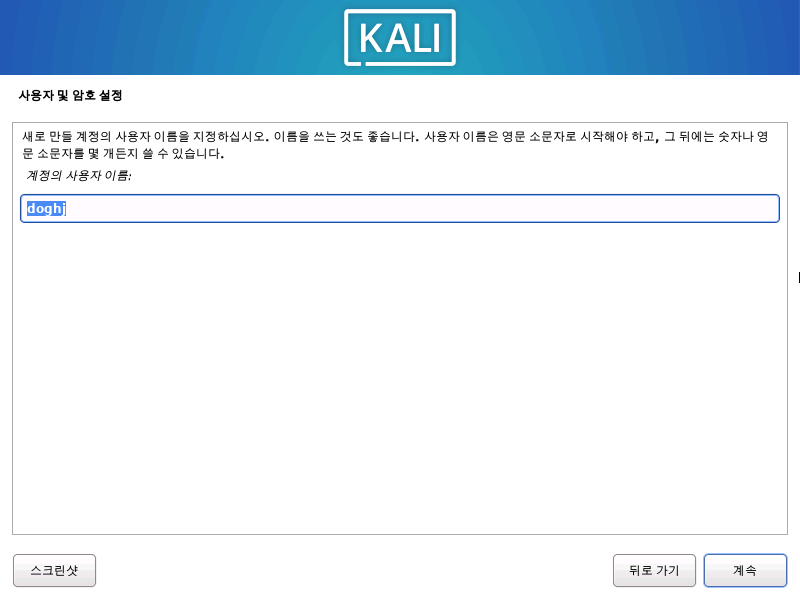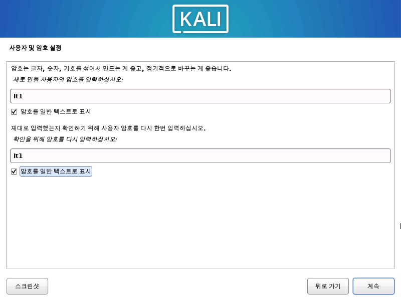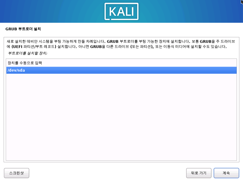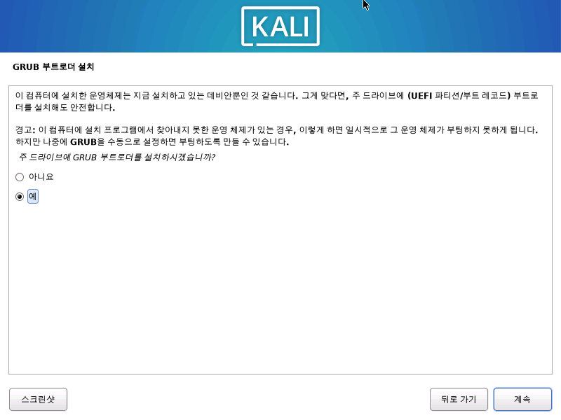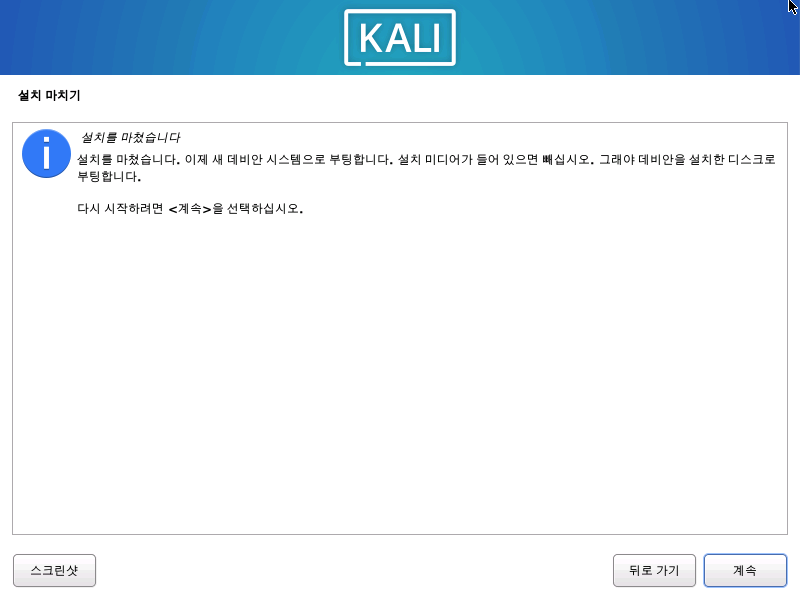 부팅을 위한 설정도 마치면 Kali 리눅스가 재시작 하면서 끝이난다.