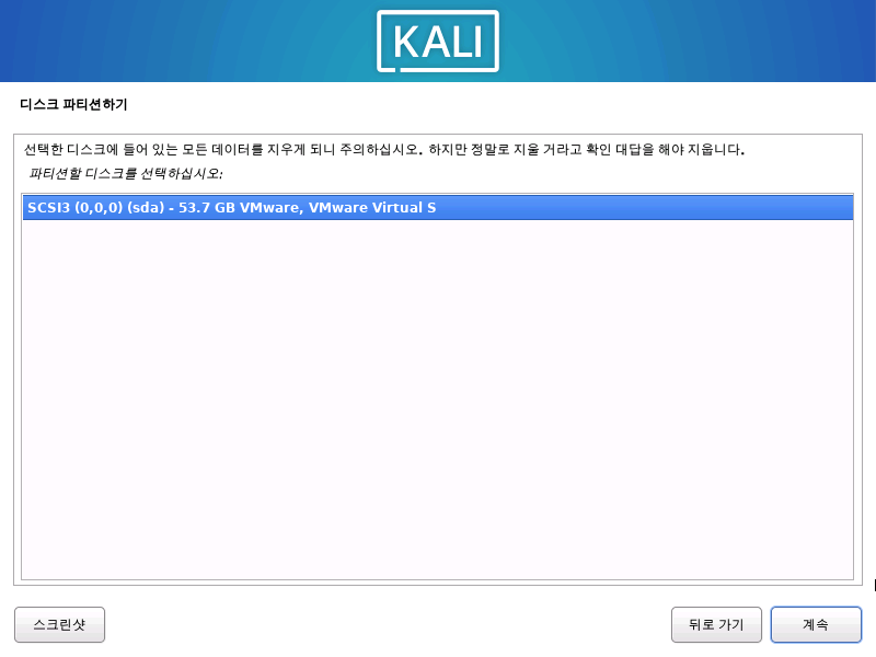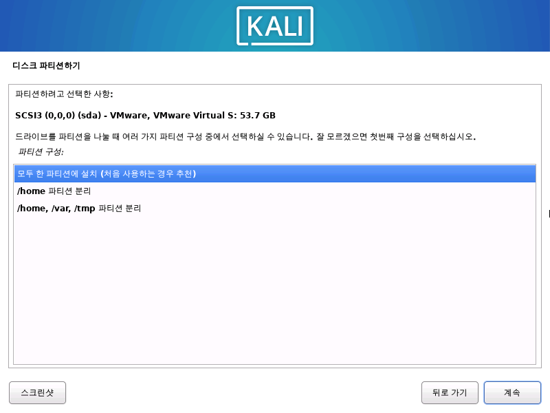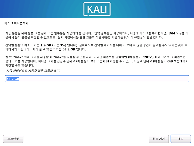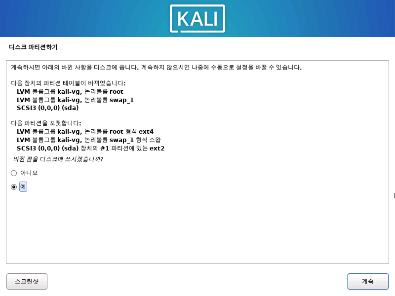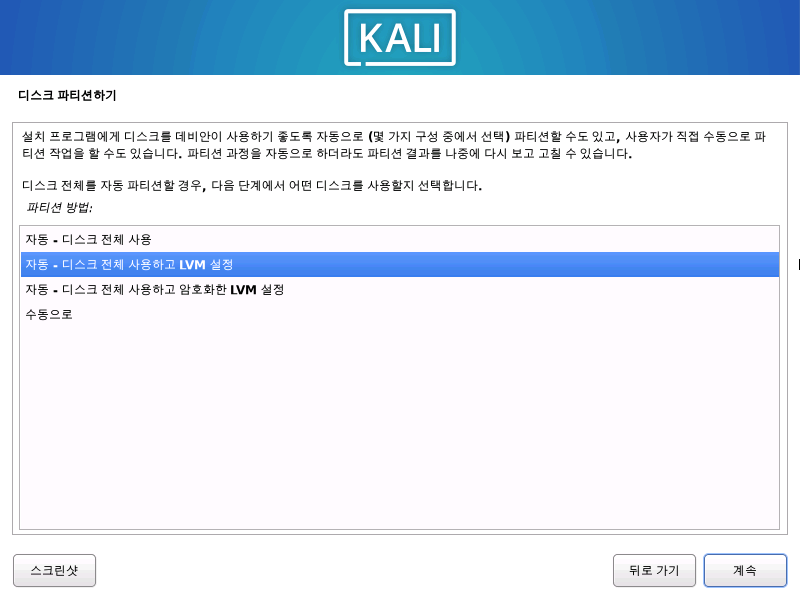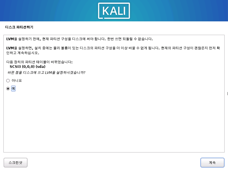 KALI도 일반 리눅스들 처럼 파티션 LVM 설정을 해준다.