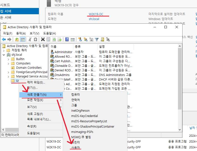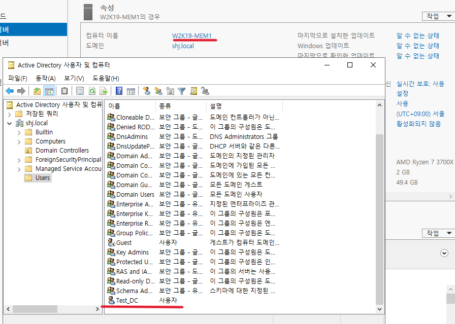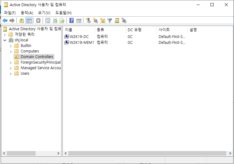이제는 W2K19-DC의 사용자 및 컴퓨터 도구를 확인해보면 Domain Controller가 두개가 되었다.