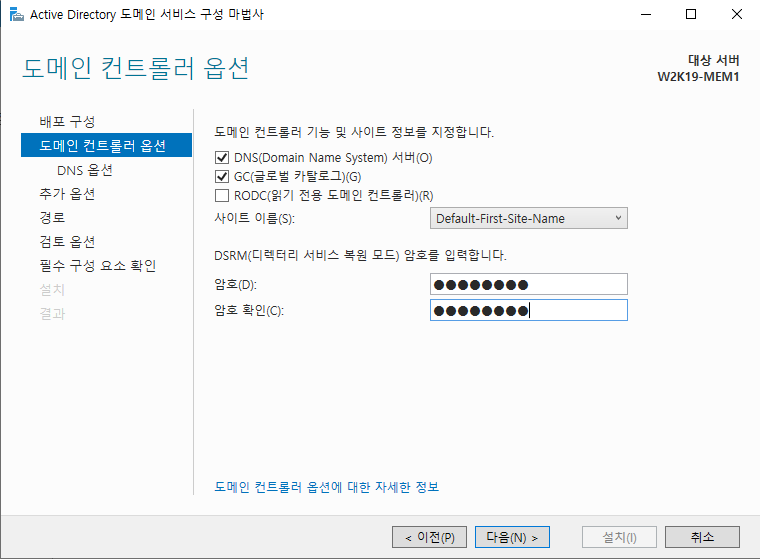 GC와 DNS 기능은 기본으로 두고 DSRM 암호를 설정해준다.
