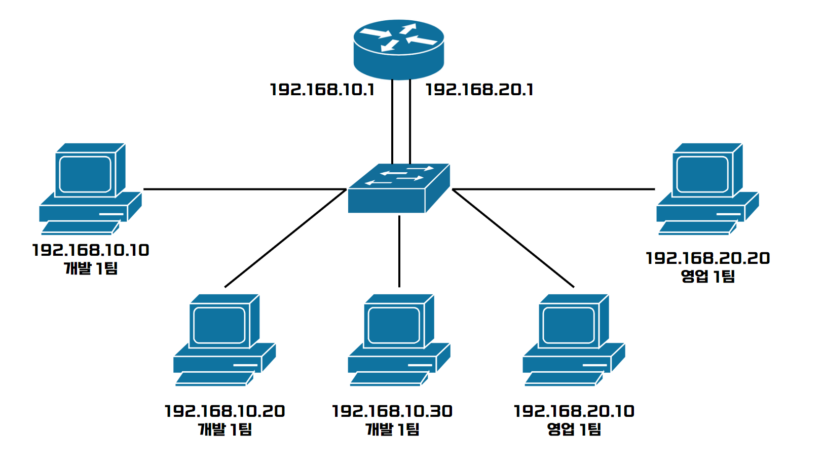 개발 1팀과 영업 1팀은 다른 네트워크 상에 존재한다.