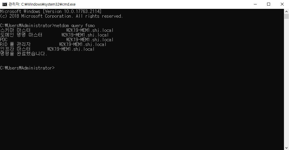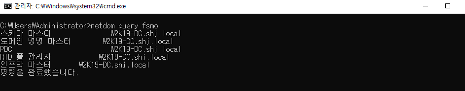 그다음 cmd 창에서 netdom query fsmo 를 입력해주자