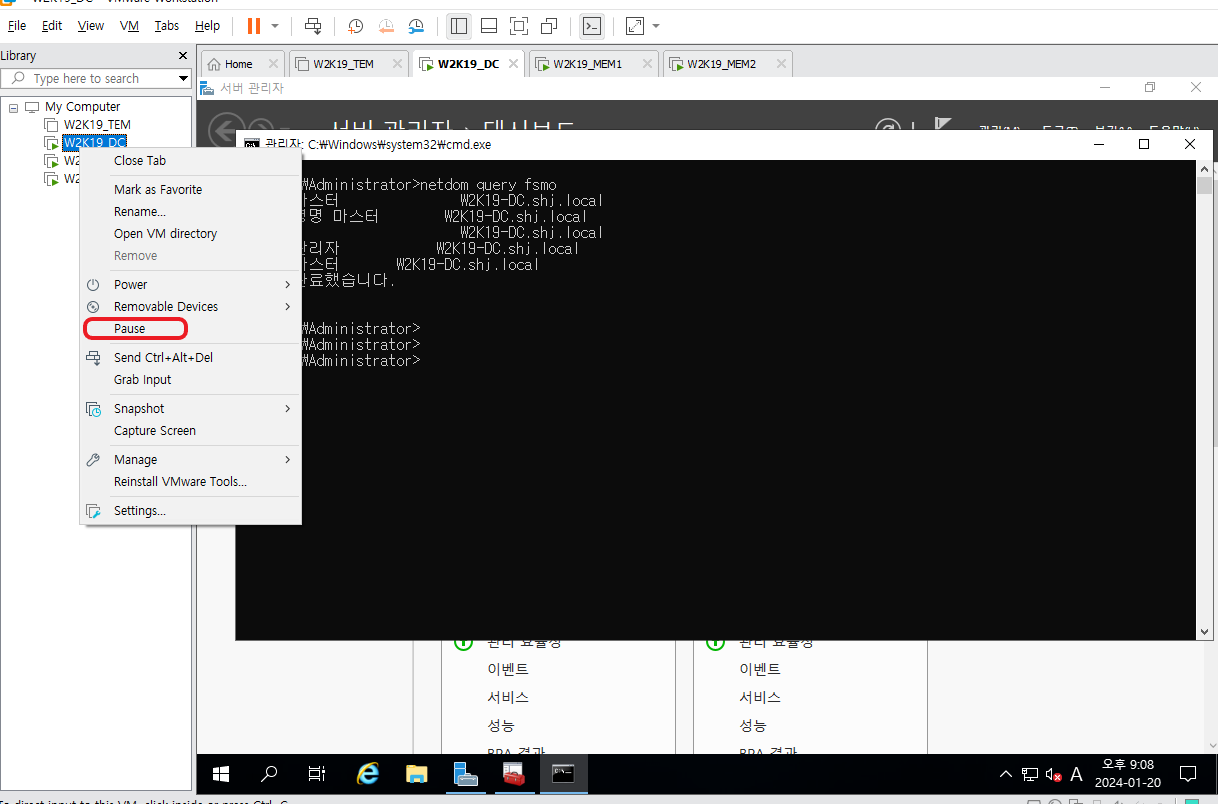 설치를 완료했다면 잠시 내버려두고 VMware의 DC-PC를 pause 해두자