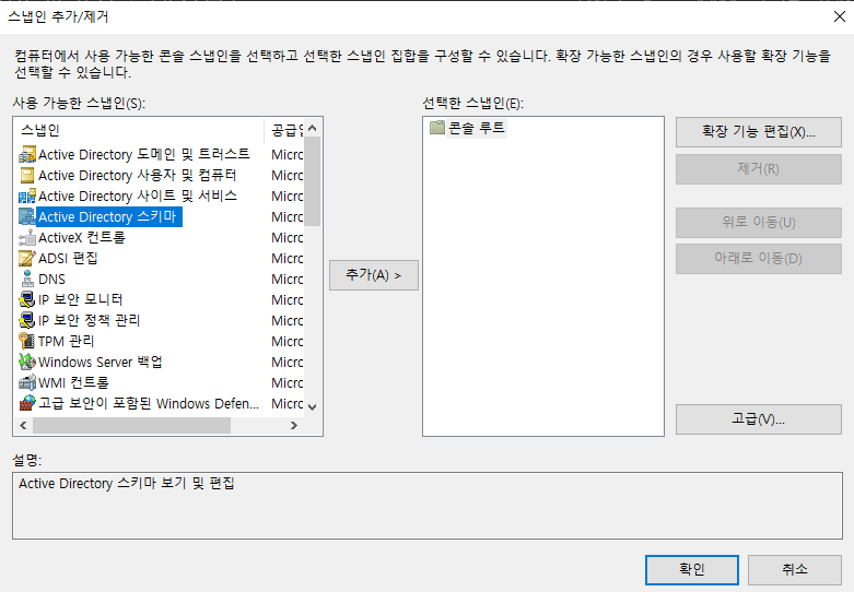 위 사진과 같이 스냅인 추가 제거 창에서 스키마 마스터가 뜨지 않으면 다음과 같이 해주면 된다.