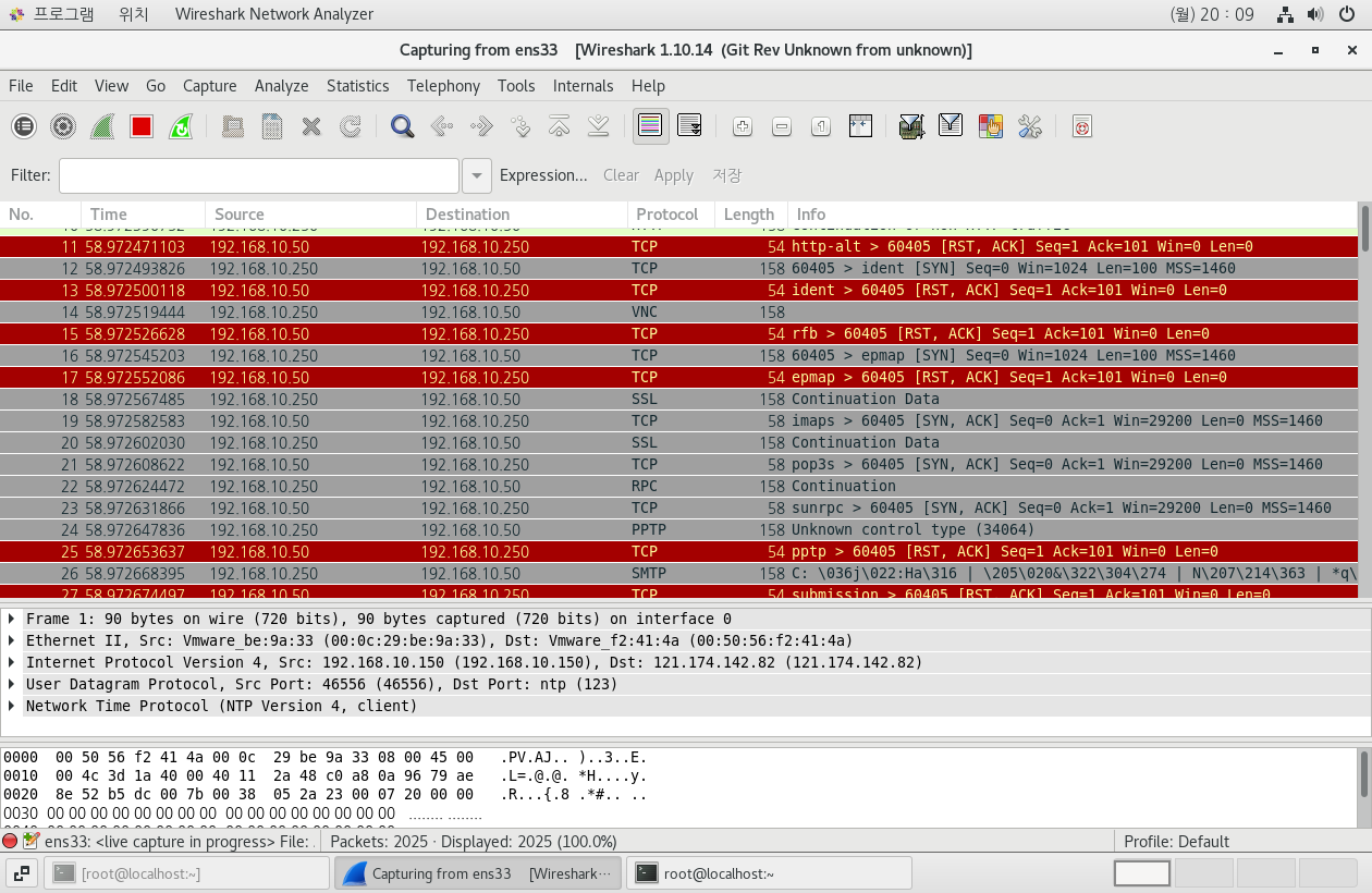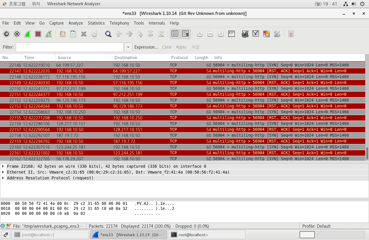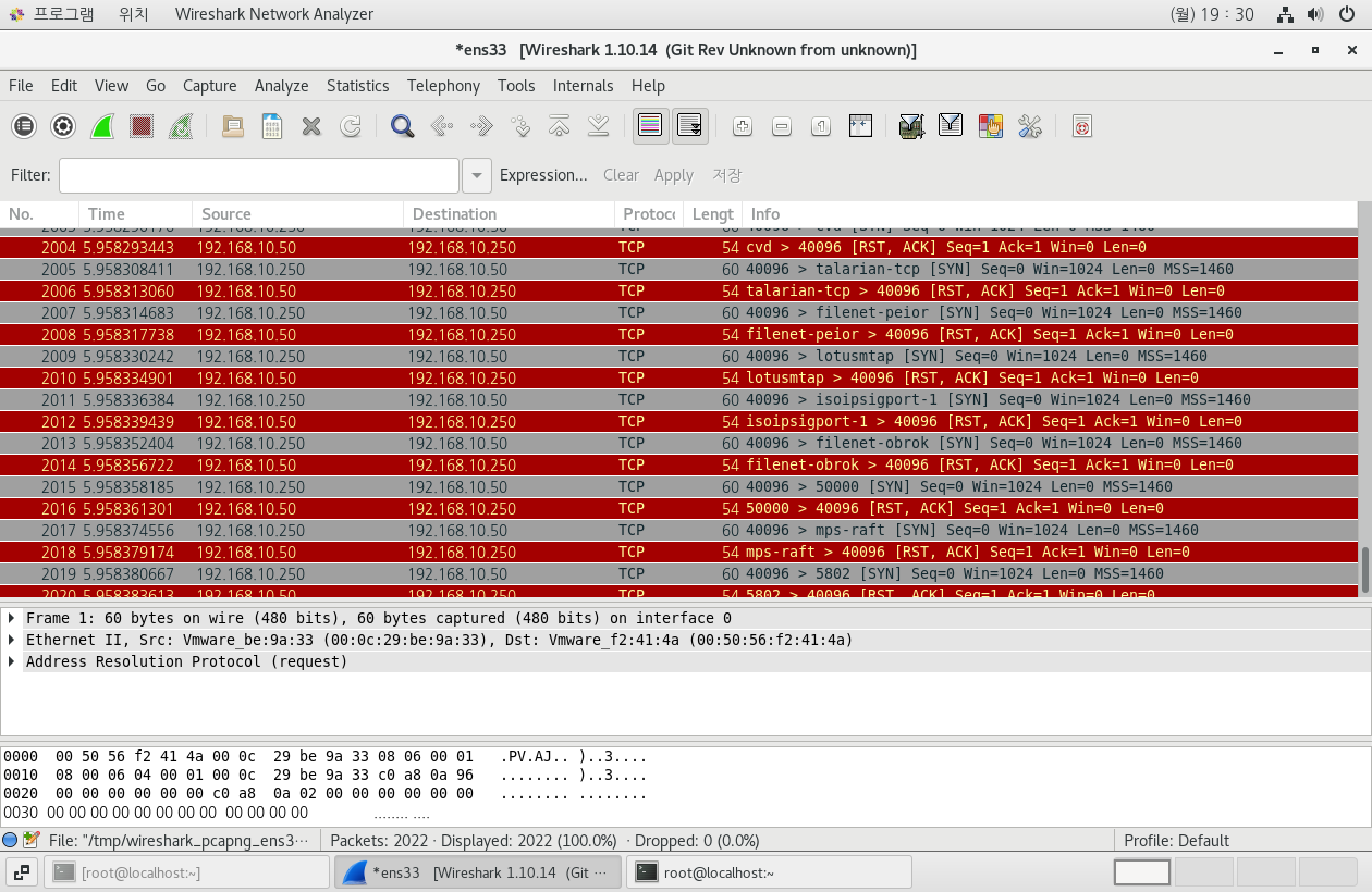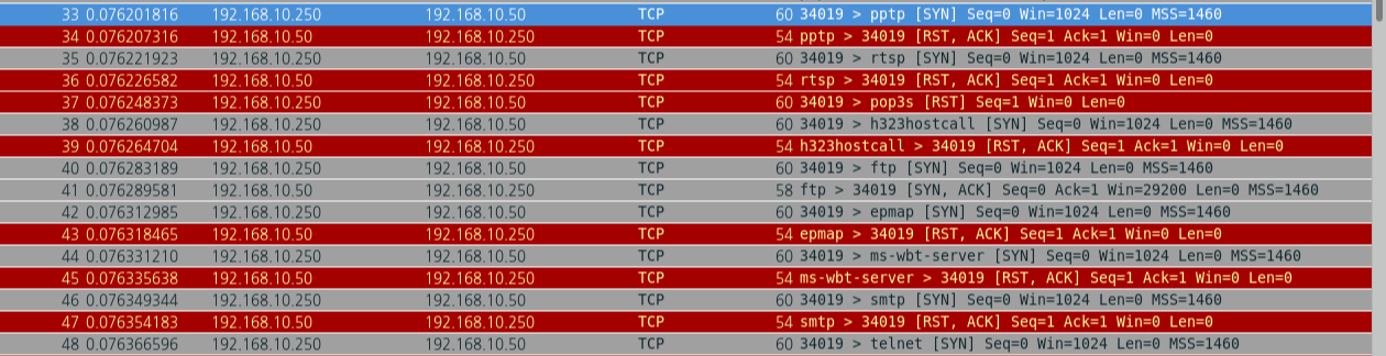 시작한 뒤에 포트 스캐닝을 실시하고 wireshark 를 중지한 뒤에 로그를 확인해보자