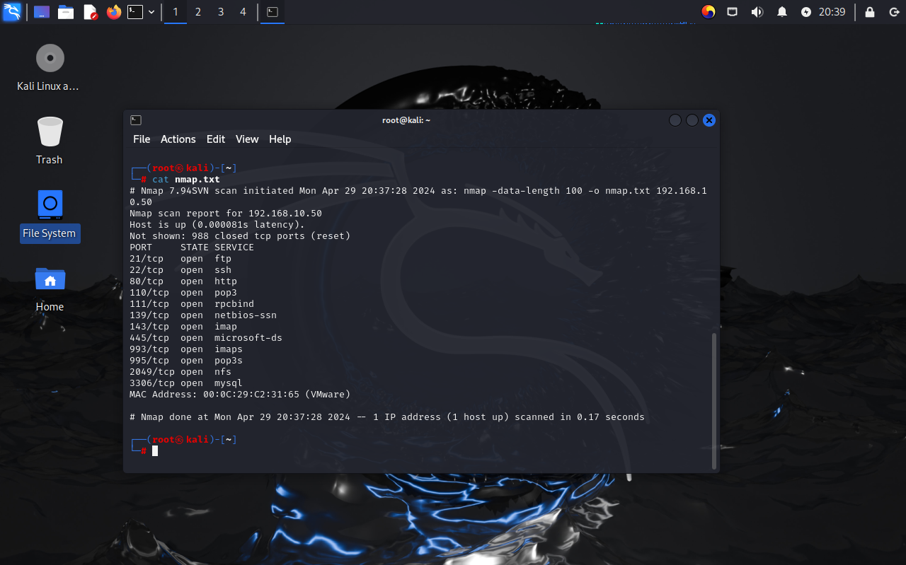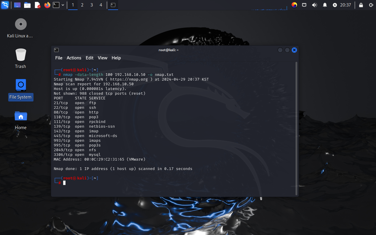 nmap -data-length 100 192.168.10.50 > nmap.txt