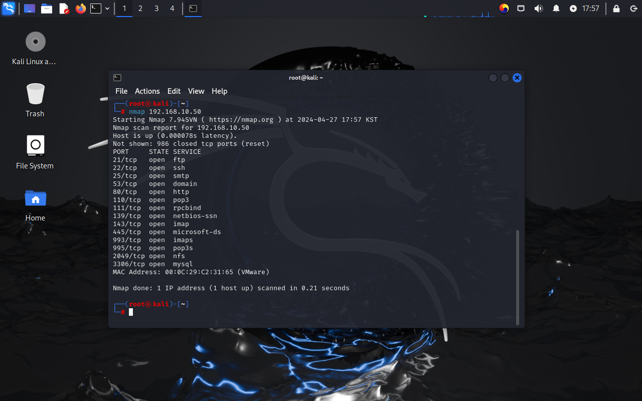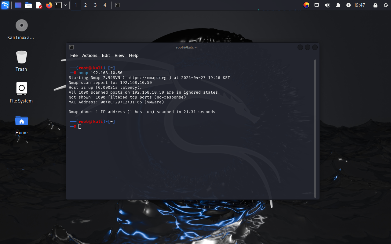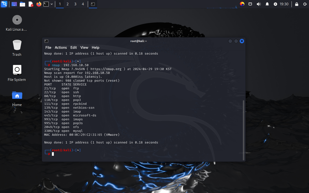 Kali Linux의 nmap 명령어로 개방되어 있는 포트를 확인해볼 수 있다.