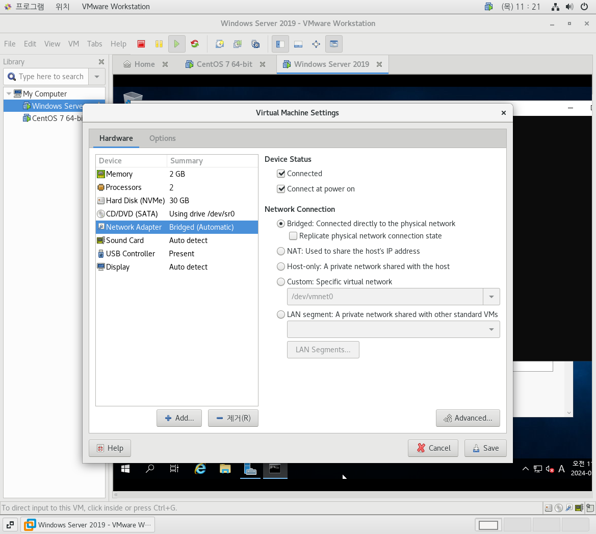 설치가 완료 됐으면 모든 가상머신을 Briged로 변경한 뒤에
