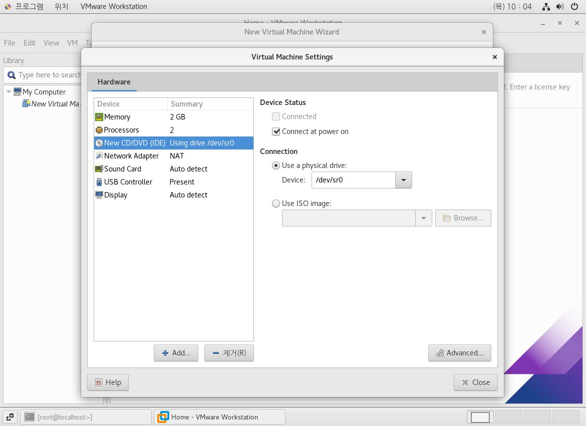 실제 PC에 설치된 VM웨어 창 오른쪽 아래 CD 모양 아이콘을 오른쪽 클릭 해보자