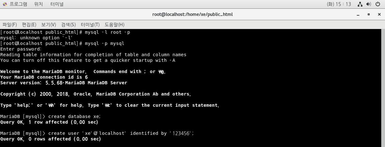 MariaDB [mysql]> create user 'xe'@'localhost' identified by '123456';