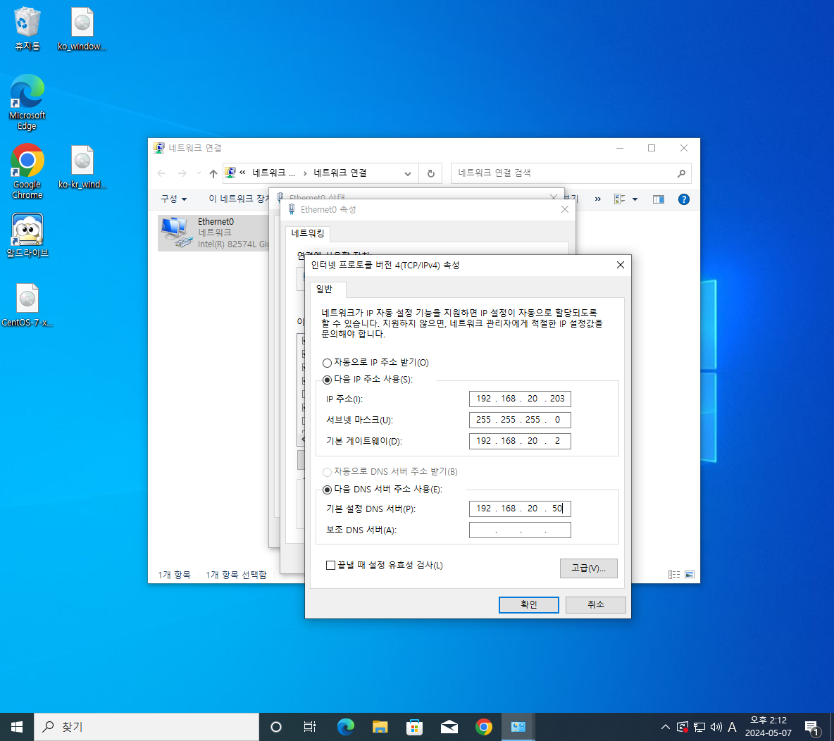 그다음 윈도우10에서 DNS 서버를 변경 해주고